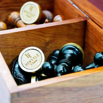 Nắp hộp được khắc CNC hình quân Xe và quân Mã (cùng là hình logo của Henry Le Chess), thể hiện hộp cờ vua chuyên dụng, phần nắp hộp và thân hộp gắn kết bởi nam châm để hai phần này luôn được giữ ngay cả khi hộp không được khoá.