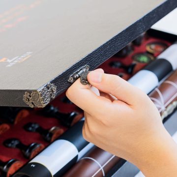 Mỗi quân cờ được tiện thủ công và ghép vào phần đế nỉ da lộn màu đỏ in logo Henry Le Chess.